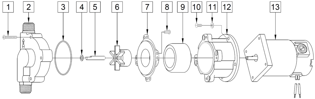 - Wet End: Polysulfone (Front Housing), Stainless Steel (Rear Housing. Shaft), Teflon (Thrust Washer), Silicone (O-Ring), Ryton/Teflon/Glass (Impeller)