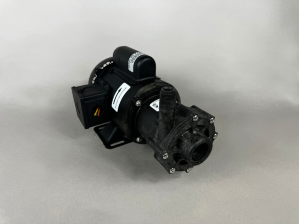March Pump’s industrial TE-5KC-MD is an American seal-less centrifugal magnetic drive pump ideal for applications such as chemical recirculation, chemical transfer, and scrubber systems. It is capable of generating a maximum flow of 17 gallons per minute at 4 feet, and its maximum head is 29 Feet (12PSI). The standard wet end (the materials that come into contact with the solution) is composed of carbon filled Kynar (PVDF), Viton, and Ceramic. The inlet connection is 1 inch female pipe thread, and the outlet is 1/2 inch male pipe thread. The standard motor is a 1 Phase 60 hertz 115/230V and 50 hertz 110/220V 0.2 horsepower totally enclosed fan cooled motor. There are performance differences between the hertz options. The maximum internal pressure the pump can tolerate is 75PSI, and the maximum liquid temperature is 200 Fahrenheit or 93 Celsius. The March TE-5KC-MD centrifugal magnetic drive pump is capable of handling mildly or highly corrosive chemicals, acids, and solvents. To determine if the March TE-5KC-MD is suitable for your application, please contact March Pump.