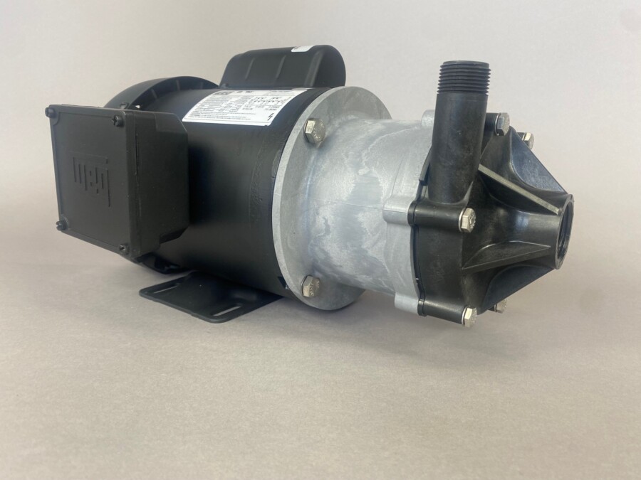 March Pump’s industrial TE-6P-MD is an American seal-less centrifugal magnetic drive pump ideal for applications such as chemical recirculation, chemical transfer, and scrubber systems. It is capable of generating a maximum flow of 38 gallons per minute at 10 feet, and its maximum head is 49 Feet (21PSI). The standard wet end (the materials that come into contact with the solution) is composed of Polypropylene, Viton, Ryton/Teflon/Carbon, and Ceramic. The inlet connection is 1 inch female pipe thread, and the outlet is 3/4 inch male pipe thread. There are two standard motors. The first is a 1 Phase 60 hertz 115/208/230V and 50 hertz 115/230V 0.5 horsepower totally enclosed fan cooled motor. The second is a 3 Phase 60 hertz 208/230/460V and 50 hertz 190/380V 0.5 horsepower totally enclosed fan cooled motor. There are performance differences between the hertz options. The maximum internal pressure the pump can tolerate is 50PSI, and the maximum liquid temperature is 190 Fahrenheit or 87 Celsius. The March TE-6P-MD centrifugal magnetic drive pump is capable of handling mildly or highly corrosive chemicals, acids, and solvents. To determine if the March TE-6P-MD is suitable for your application, please contact March Pump.