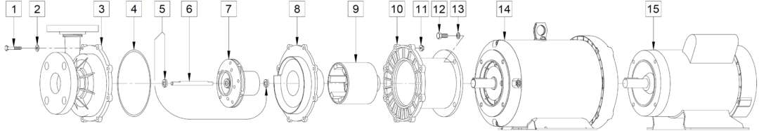 March Pump’s industrial Flanged TE-7.5K-MD is an American seal-less centrifugal magnetic drive pump ideal for applications such as chemical recirculation, chemical transfer, and deionized water systems. It is capable of generating a maximum flow of 82 gallons per minute at 40 feet, and its maximum head is 85 Feet (37PSI). The standard wet end (the materials that come into contact with the solution) is composed of natural Kynar, Viton, Carbon, and Ceramic. The inlet connection is 2 inch ANSI Class 150 Flange, and the outlet is 1-1/2 inch ANSI Class 150 Flange. There are two standard motors. The first is a 1 Phase 60 hertz 115/208/230V 2 horsepower totally enclosed fan cooled motor. The second is a 3 Phase 50/60 hertz 208/230/460V and 50 hertz 190/380V 2 horsepower totally enclosed fan cooled motor. There are performance differences between the hertz options. The maximum internal pressure the pump can tolerate is 60PSI, and the maximum liquid temperature is 190 Fahrenheit or 87 Celsius. The March Flanged TE-7.5K-MD centrifugal magnetic drive pump is capable of handling mildly, or highly corrosive chemicals, acids, and solvents. To determine if the March Flanged TE-7.5K-MD is suitable for your application, please contact March Pump.